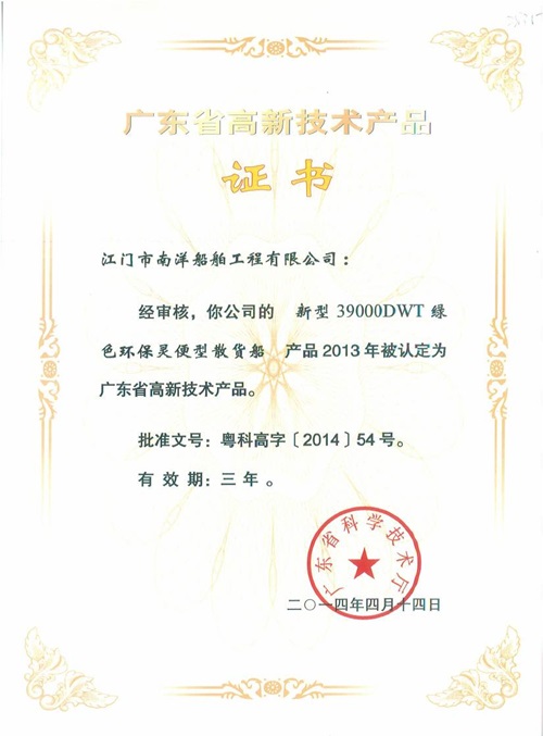 2021年3月 JNS 40000DWT綠色環(huán)保大開(kāi)口型散貨船被認(rèn)定為2020年高新技術(shù)產(chǎn)品。