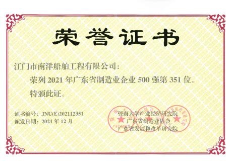 2021年5月25日 JNS第80艘小靈便型散貨船JNS179船順利交付。 ![]() 2021年12月 榮獲“廣東省制造業(yè)企業(yè)500強(qiáng)” 。