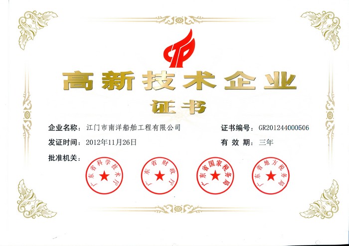 2012年11月26日,江門市南洋船舶工程有限公司(以下簡稱“南洋船舶”)獲得“國家高新技術企業(yè)”認定。近日,南洋船舶正式獲頒高新技術企業(yè)證書和匾牌,這也是南洋船舶自2011年9月5日被認定為廣東省省級企業(yè)技術中心以來的又一極大的突破。