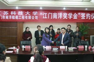 2014年3月20日下午,我司與江蘇科技大學(xué)“江門南洋獎學(xué)金”簽約儀式在江蘇科技大學(xué)學(xué)生處會議室舉行,我司財務(wù)總監(jiān)朱繼雷先生作為公司代表出席了簽約儀式。