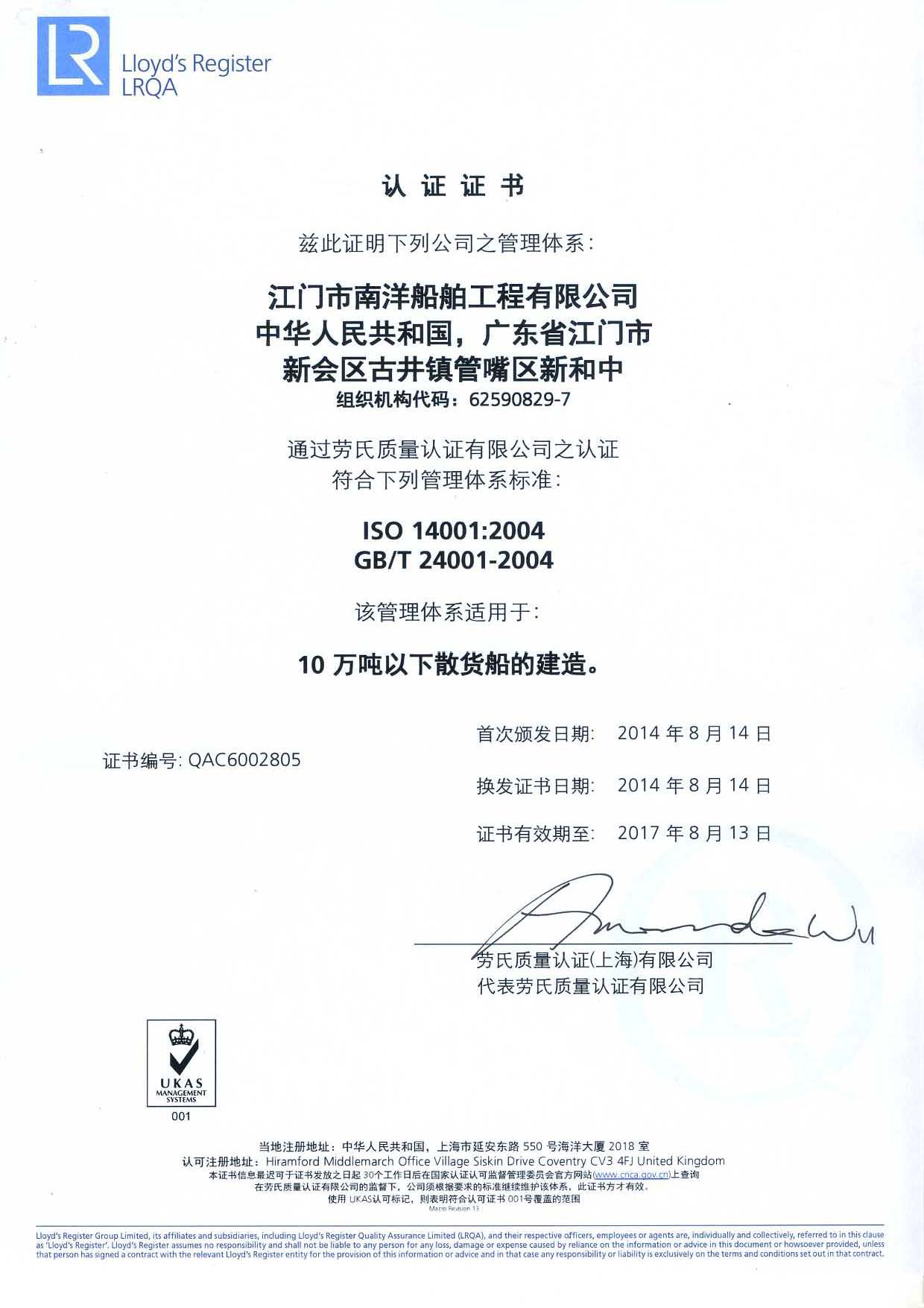 2014年8月14日,我司順利通過(guò)了ISO14001:2004環(huán)境管理體系認(rèn)證。
