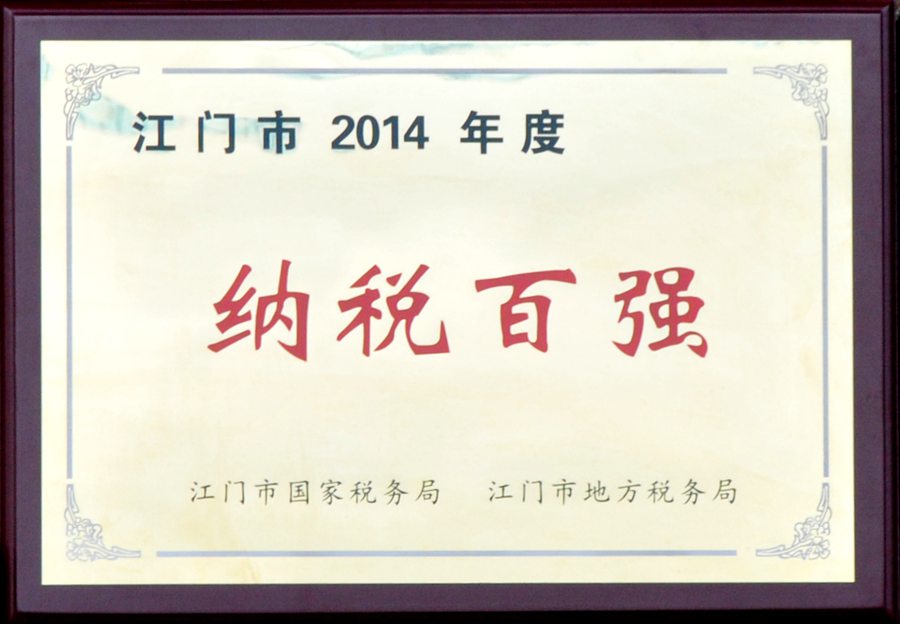 2015年5月8日,我司收到了江門市國(guó)稅局、江門市地稅局聯(lián)合頒發(fā)的“2014年度江門市納稅百?gòu)?qiáng)”獎(jiǎng)牌。