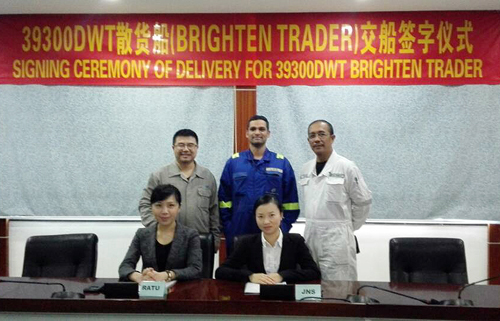 2017年1月12日上午,江門市南洋船舶工程有限公司舉辦了39300載重噸散貨船JNS149的交船簽字儀式,船東和我司雙方代表出席。