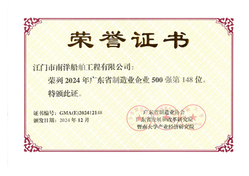 2024年12月3日,由廣東省制造業(yè)協(xié)會、暨南大學產業(yè)經濟研究院及廣東省發(fā)展和改革研究院聯(lián)合發(fā)布《2024年廣東制造業(yè)500強企業(yè)研究報告》。該報告依據企業(yè)的年度營業(yè)收入及多項關鍵指標,評選出廣東省制造業(yè)500強企業(yè)。公司作為全球小靈便型散貨船建造領先企業(yè),再次榮列2024年廣東省制造業(yè)500強企業(yè)榜單,位列第148位。